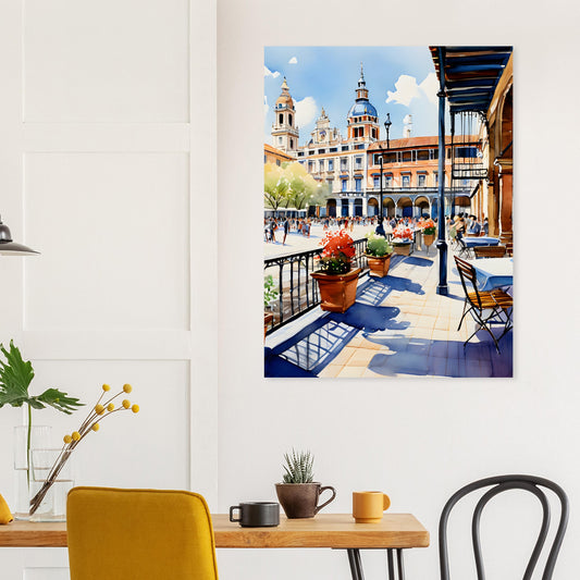 Madrid's Plaza Mayor Terrace: Vibrant Watercolor Scene