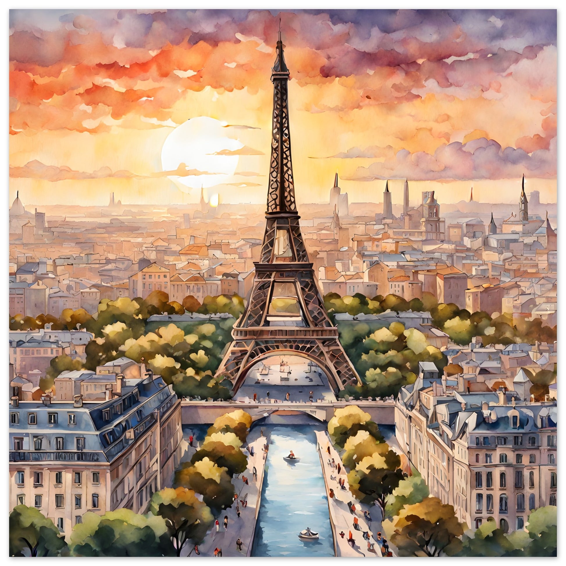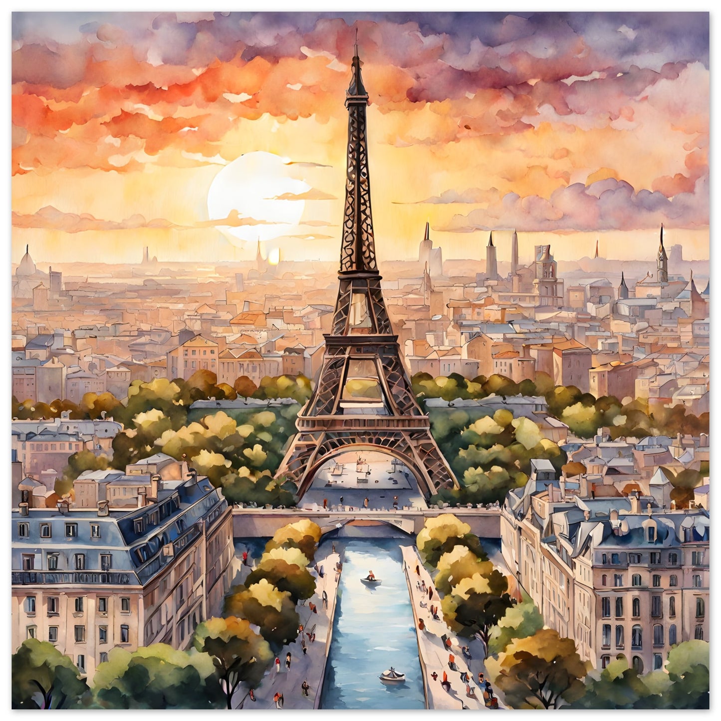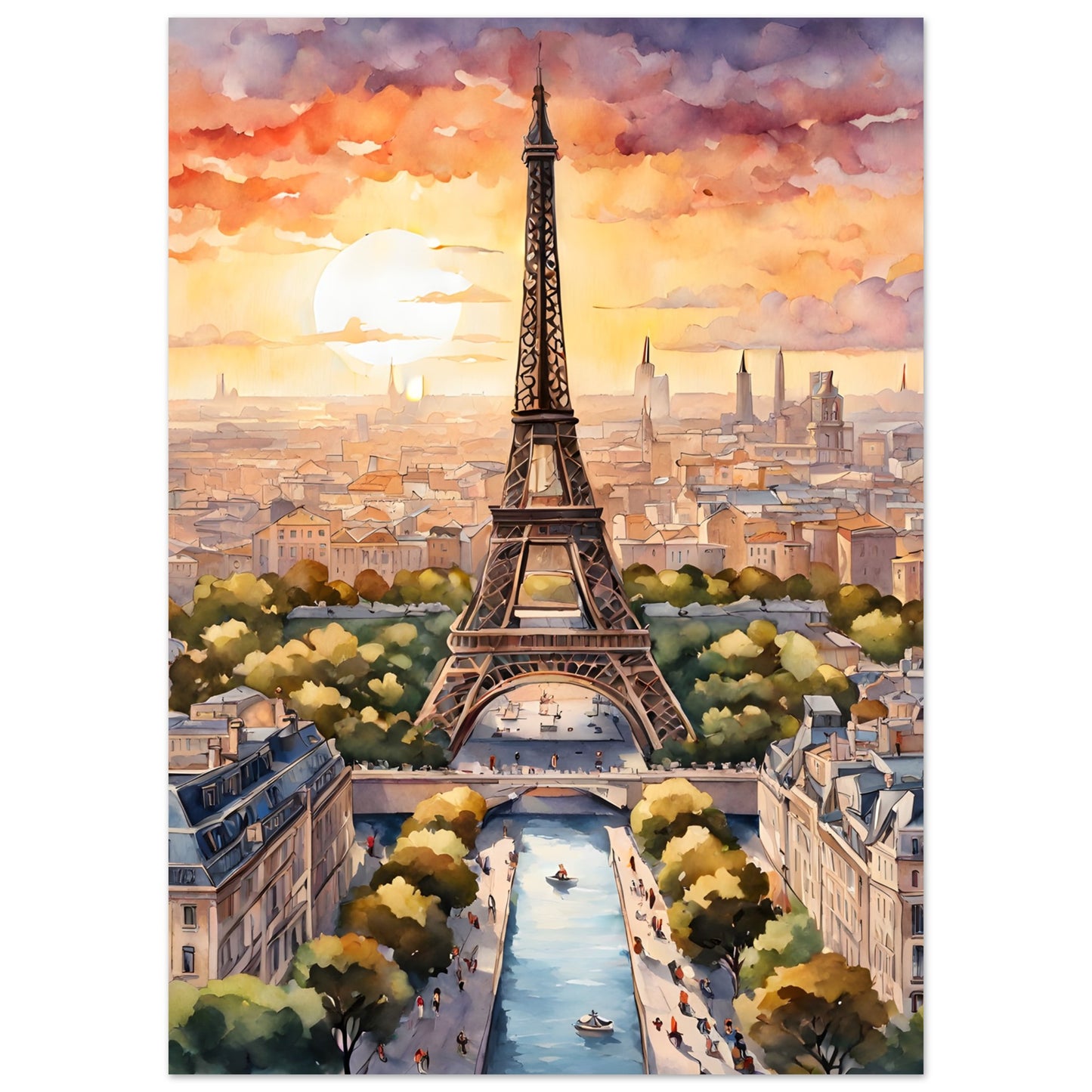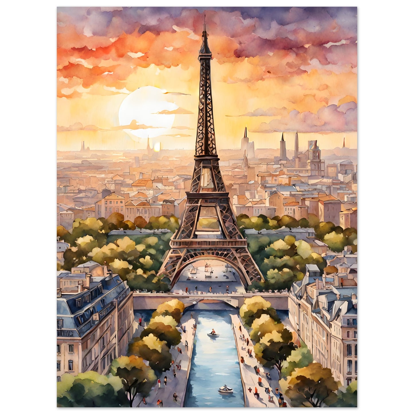 Eiffel Tower's Sunset Splendor in Watercolor Portrait